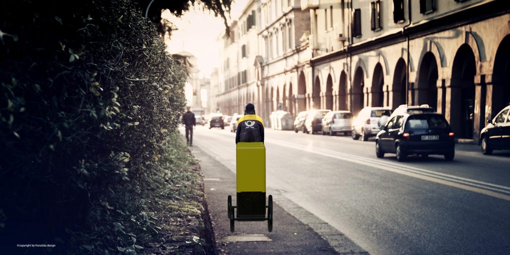 Eine zukünftige Transportmöglichkeit für die Post, die dem Postboten bei seiner Tour ermöglichen soll, die Post nicht mehr zu Fuß, sondern mit einem elektrischen Roller, auszutragen.